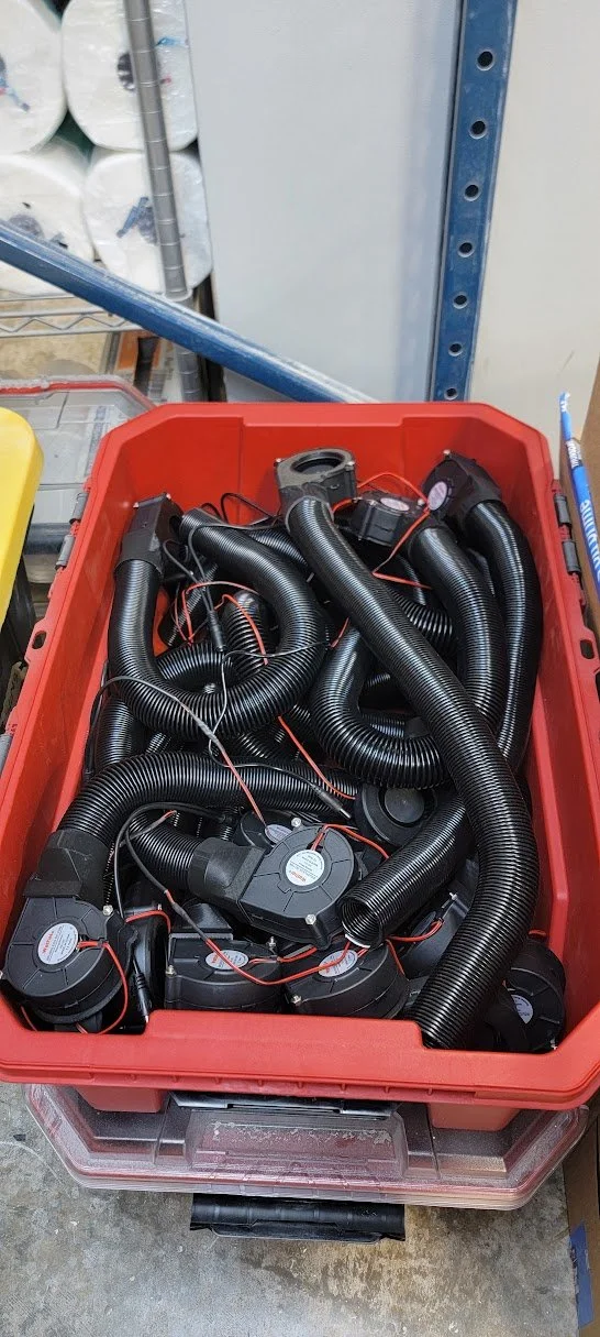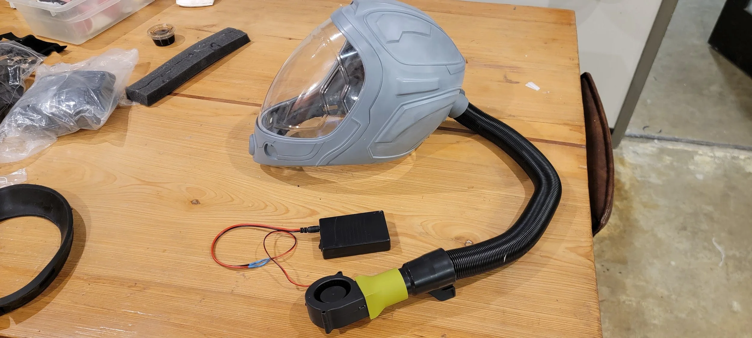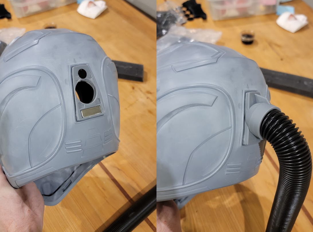 During fabrication we found, unsurprisingly, that adding a click-in shroud around the neck effectively sealed off the helmet and made for a very stuffy and foggy wearing experience. To combat this, we retrofit a magnetic hose attachment at the back of the skull that would push fresh air via a 70mm squirrel fan hidden in the backpack.